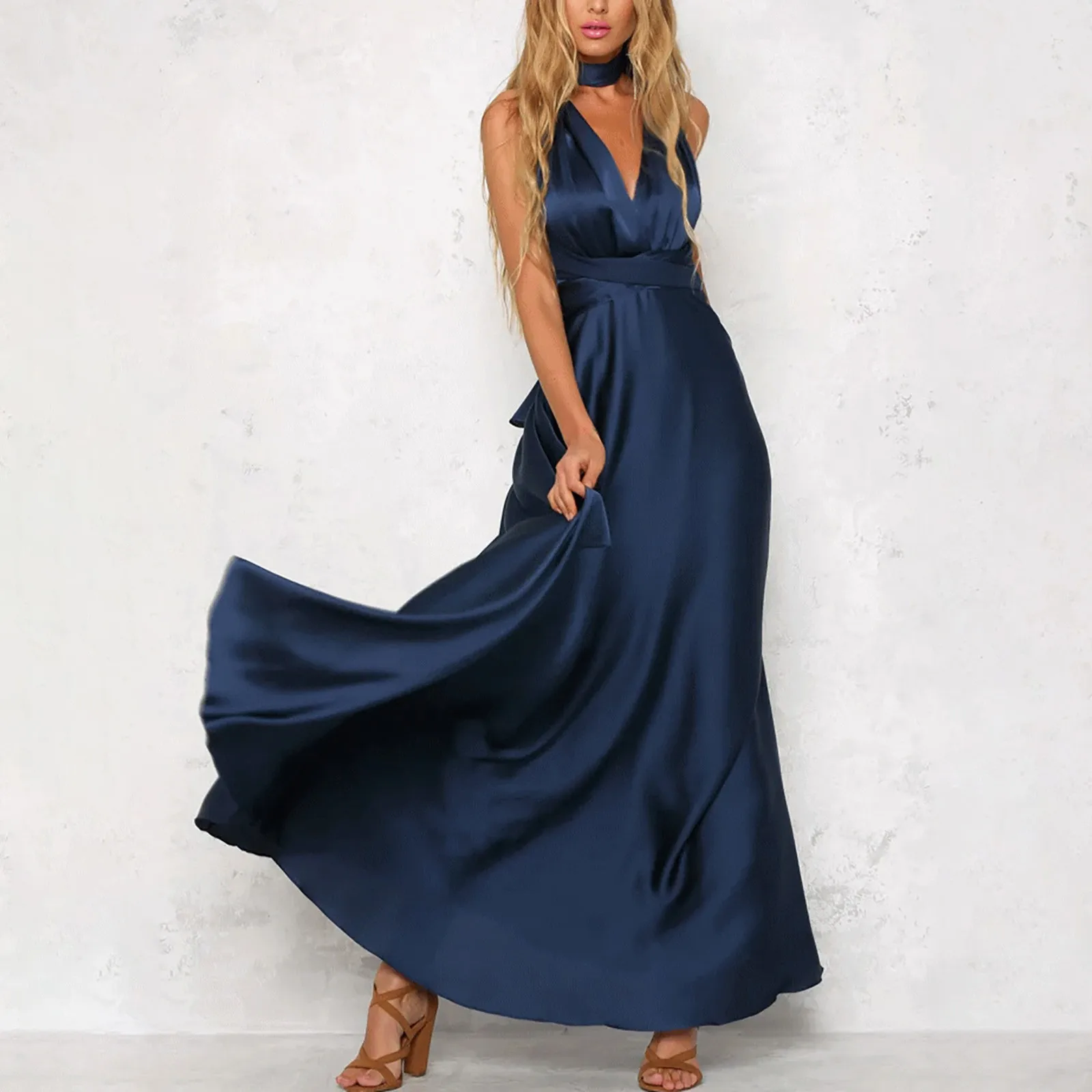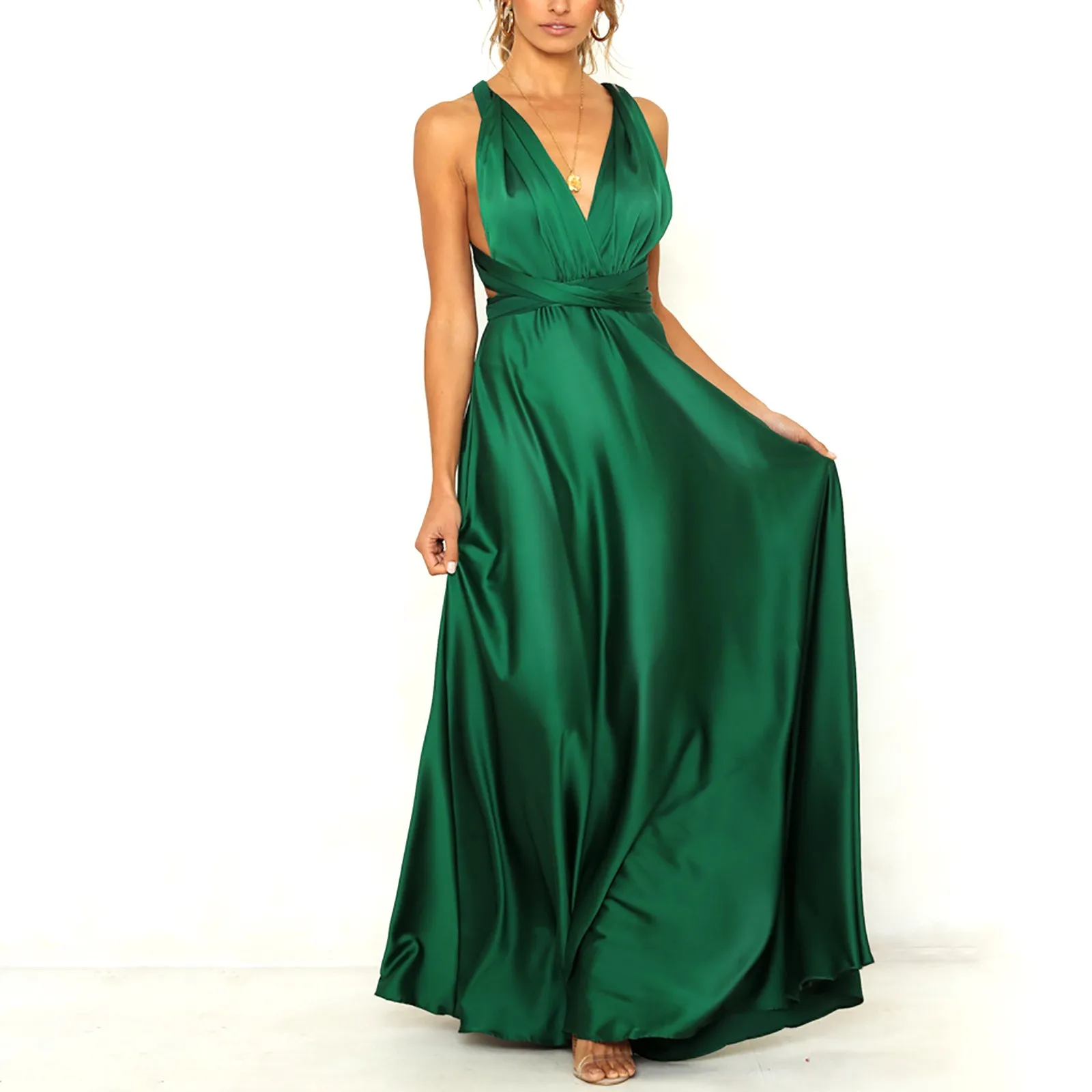 This Elegant Green Satin Maxi Dress is tailored for women who appreciate style and comfort. Its halter neckline, open back, and sleeveless design create a sleek, chic look, while the empire waist and corset back ensure a flattering fit. Made from slightly elastic satin, this dress is both breathable and resistant to wrinkles, making it a low-maintenance option for formal events. Whether worn as a green prom dress or a standout piece for a wedding or evening party, this dress exudes charm and grace.