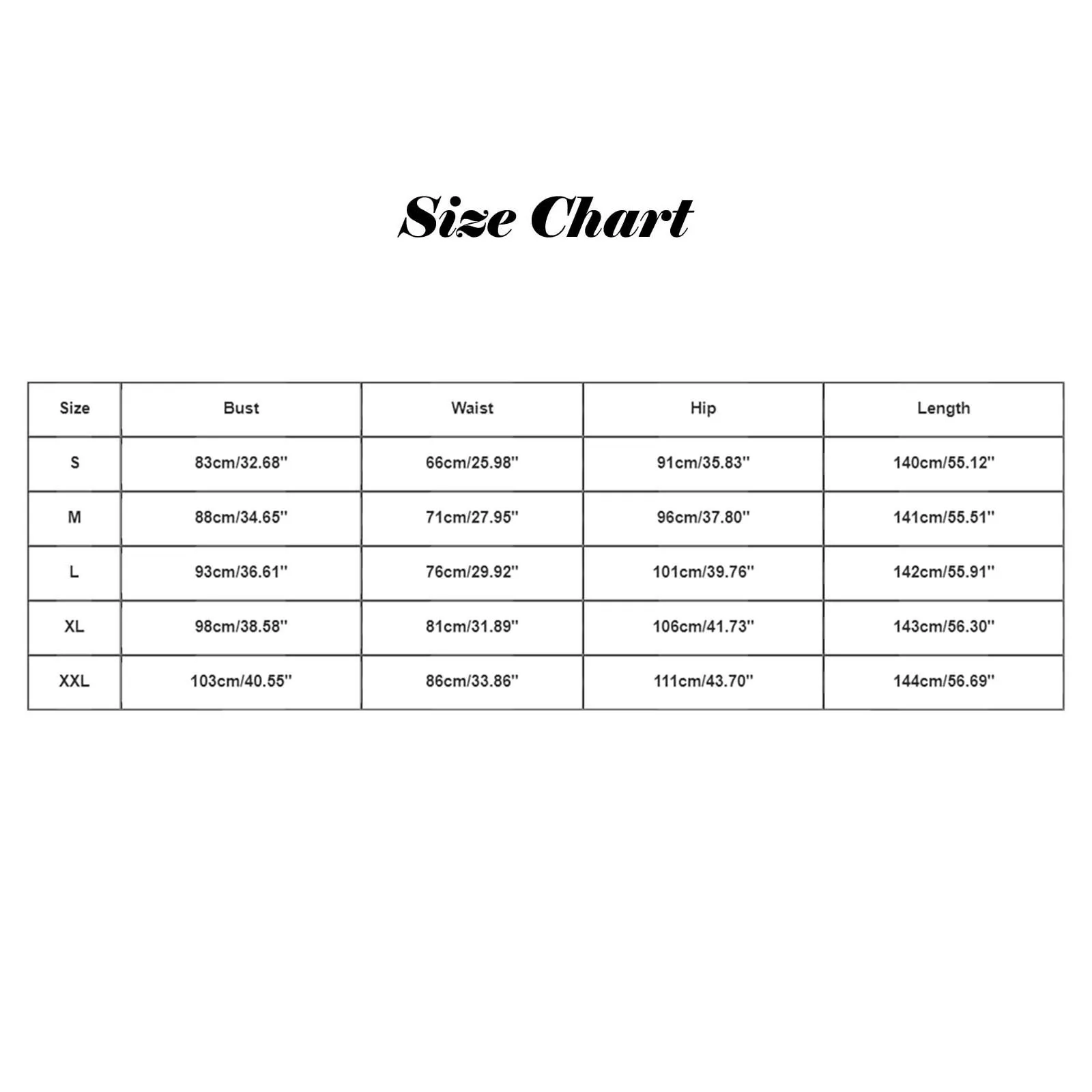 | Size:S | Bust:83cm/32.68” | Waist:66cm/25.98” | Hip:91cm/35.83” | Length:140cm/55.12” |